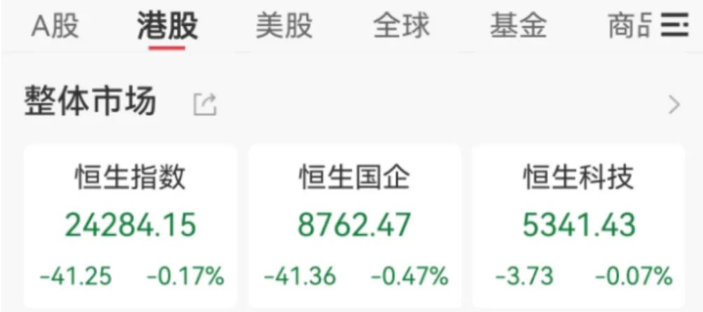 6月27日,截至收盘,恒生指数下跌0.17%,收于24284.15点;恒生科技指数下跌0.07%,收于5341.43点;恒生国企指数下跌0.47%,收于8762.47点。