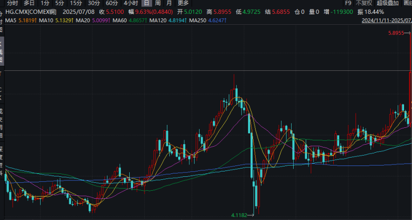 当地时间周二(7月8日),COMEX铜期货飙涨,盘中涨幅一度超过10%,这一涨幅显著。