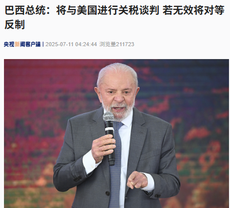 据央视新闻7月11日消息,在美国宣布将自8月1日起对巴西商品征收50%关税后,当地时间7月10日,巴西总统卢拉接受采访时表示,巴西将与美国进行关税谈判,若无效将采取对等反制措施。