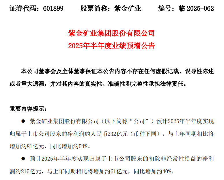 紫金矿业预计2025年上半年净利润约232亿元,同比增长54%,主要得益于矿产金、铜、锌、银销售价格同比上升,其中铜价上涨对公司业绩贡献显著。
