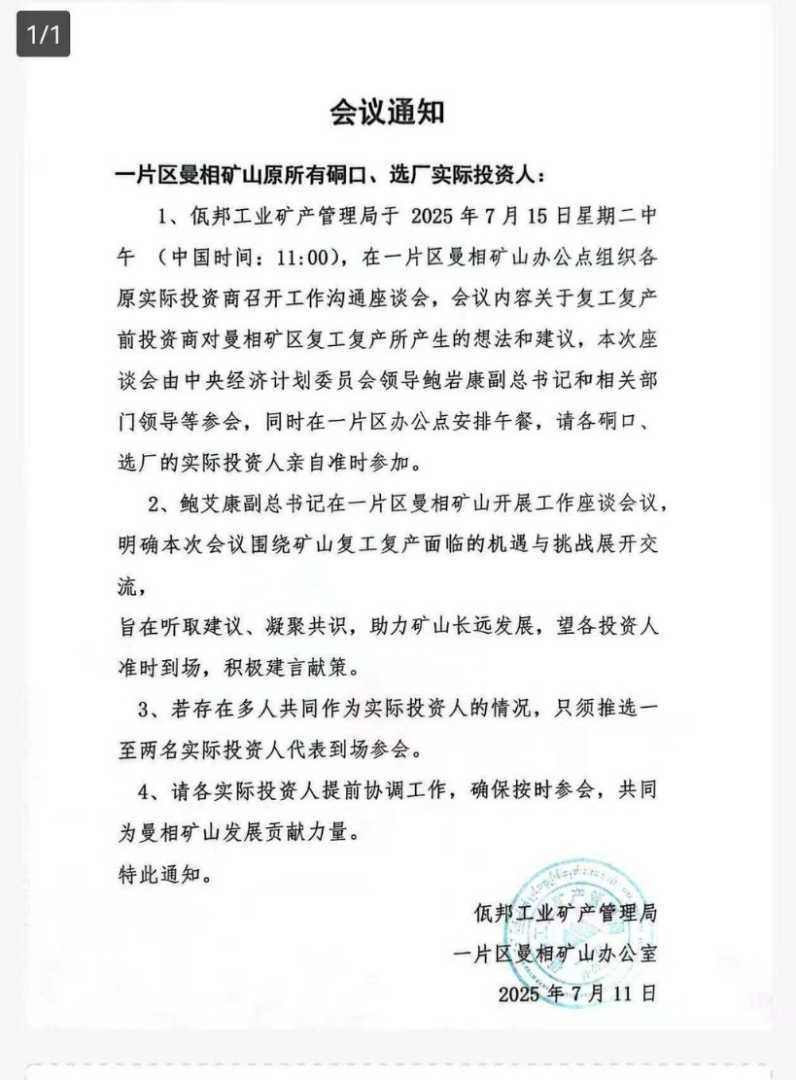 佤邦工业矿产管理局于2025年7月15日星期二中午(中国时间:11:00),在一片区曼相矿山办公点组织各原实际投资商召开工作沟通座谈会。此次会议聚焦于复工复产前,投资商对曼相矿区复工复产所产生的想法和建议,这对于矿区的未来发展具有重要意义,也为相关矿产品的市场走势带来潜在影响,比如铜等矿产品的供应预期可能会因复工复产情况而发生变化。