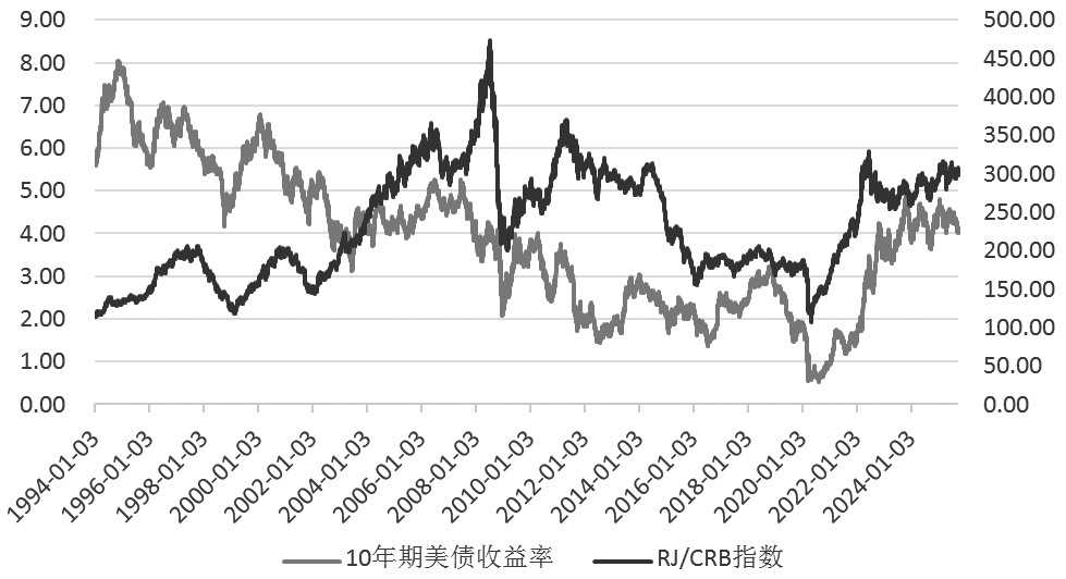 图为10年期美债收益率与商品价格指数走势对比(单位:%、点)