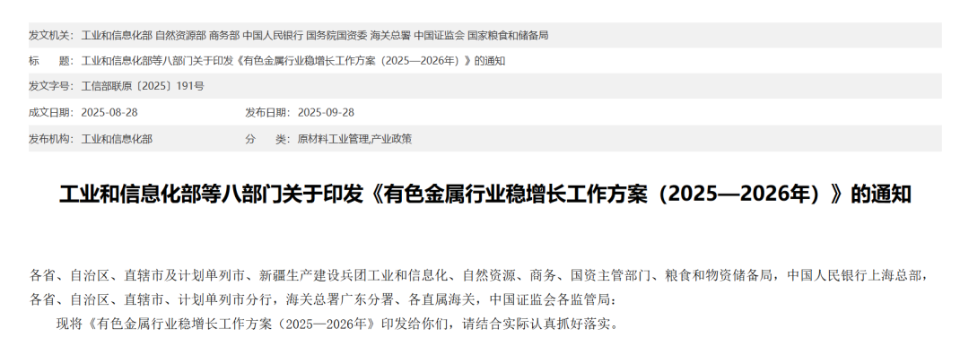 9月28日,工业和信息化部等八部门联合发布《有色金属行业稳增长工作方案(2025—2026年)》,明确提出通过提升产业链韧性、扩大高端供给、推动绿色转型等措施实现行业高质量发展。方案特别强调铜、铝等国内资源开发取得积极进展,再生金属产量突破2000万吨,高端产品供给能力持续增强。