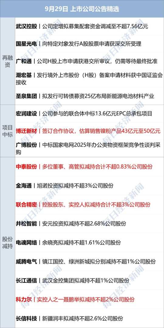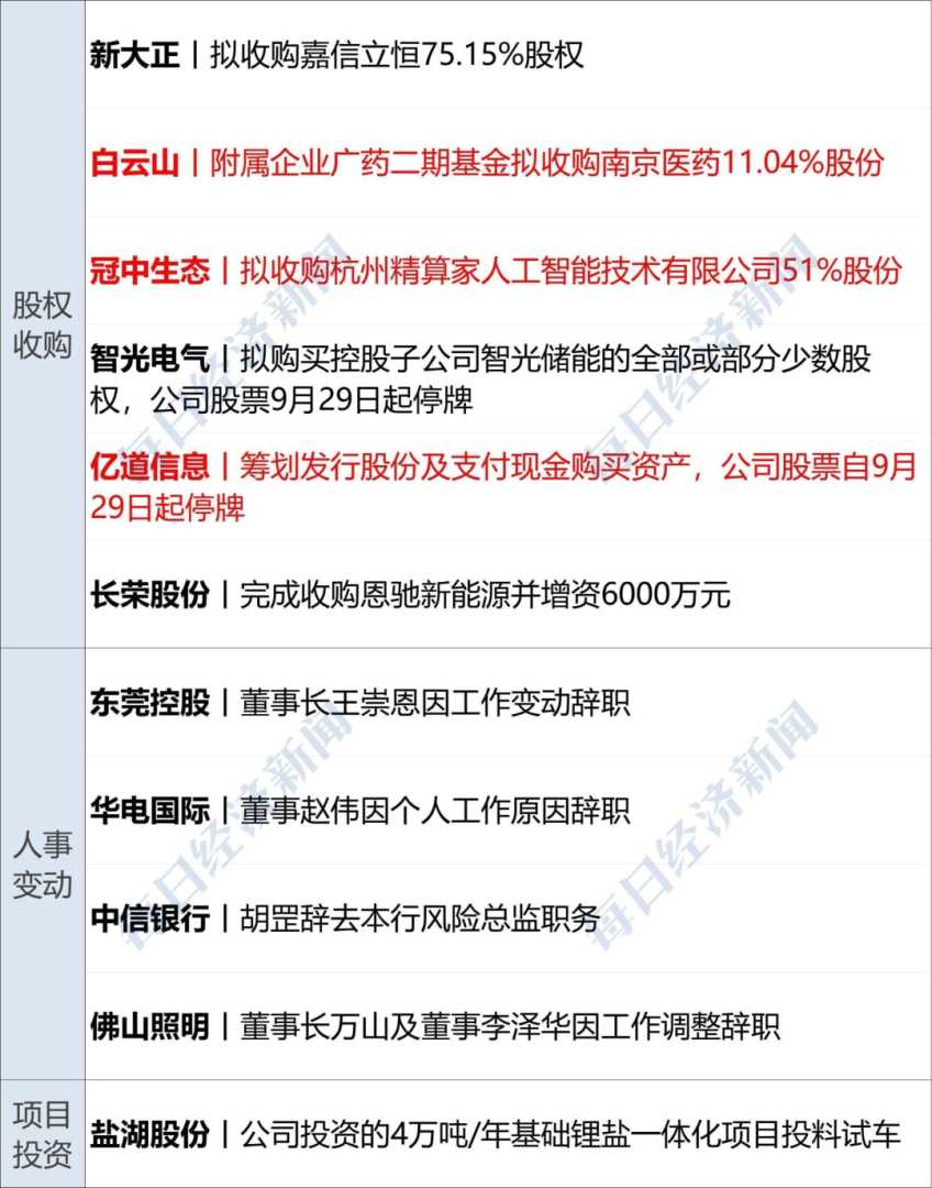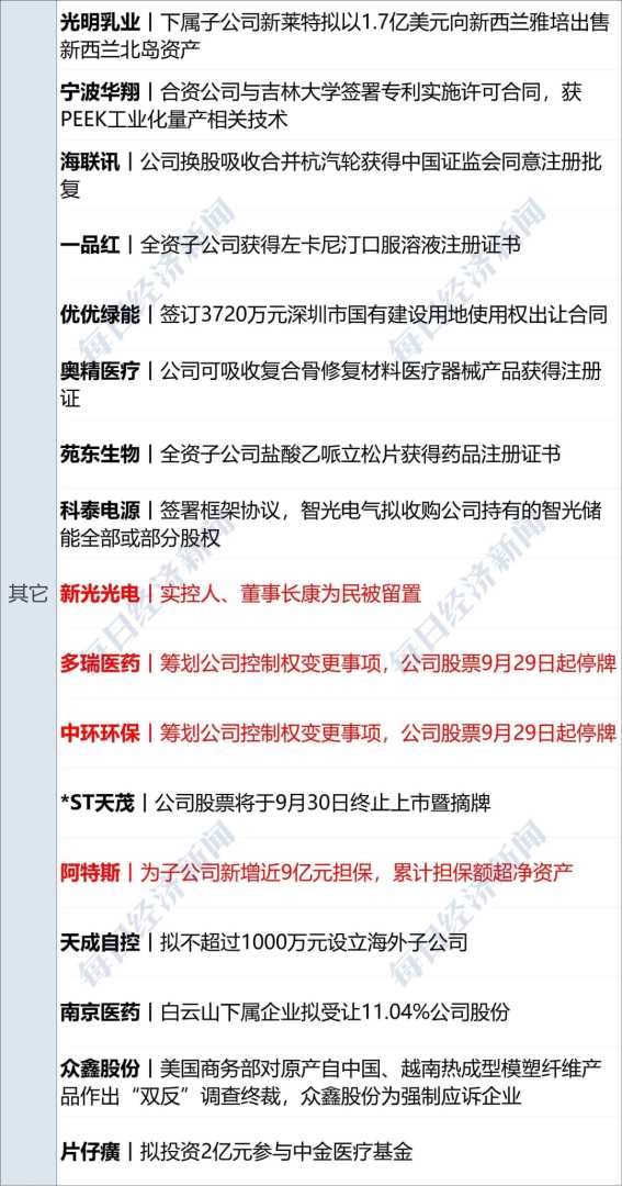 中国生物:9月28日,中国生物官微发文宣布,由国药集团中国生物所属成都生物制品研究所和中国生物研究院联合自主研发的四价人乳头瘤病毒疫苗(汉逊酵母)(爱薇佳)正式获国家药监局批准上市,这是首个获批上市的国产四价HPV疫苗。星河动力航天:9月28日,北京星河动力航天科技股份有限公司完成D轮融资,融资总额共计24亿元,将用于加快运载火箭研制及相关能力建设。