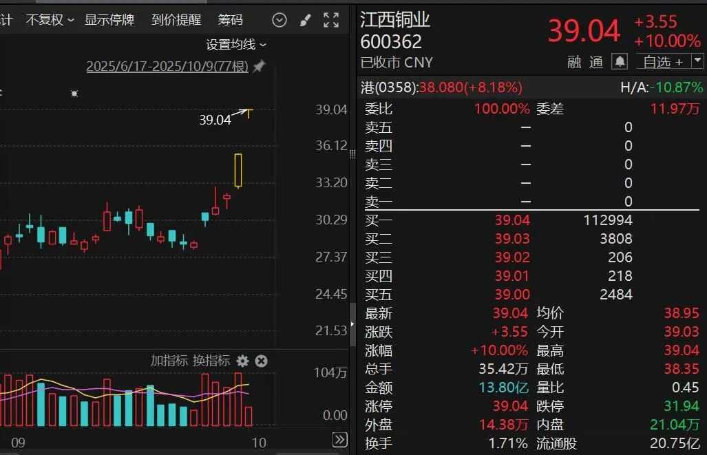 有色板块冲高,铜陵有色与江西铜业涨停,铜价创新高