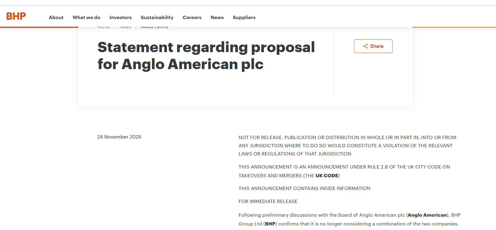 当地时间周一,全球矿业巨头必和必拓(BHP)表示,在与英美资源集团(Anglo American)举行新的会谈后,将不再寻求收购该公司。据悉,总部位于澳大利亚墨尔本的必和必拓最早于去年4月接触在伦敦上市的英美资源集团,提出潜在收购要约,理由是两家公司在优质铜矿及其他业务上的整合将带来显著的协同效应。然而,这一约500亿美元的收购提议遭到英美资源集团数次拒绝。此后,英美资源与加拿大的泰克资源公司达成合并协议,并将在下月提交股东表决。必和必拓周一在一份声明中表示,已经与英美资源集团董事会进行了更多讨论,现在已不再考虑两家公司合并事宜。声明称:“尽管必和必拓仍然认为,与英美资源集团合并具有强大的战略意义,并将为所有利益相关方创造重大价值,但我们对自身的增长战略所蕴含的巨大潜力充满信心。”根据英国收购规则,未来六个月内必和必拓受限不得再向英美资源集团提出报价,除非出现第三方公开竞标等例外情形。在当下的全球矿业中,很少有大宗商品像铜一样受到如此追捧。铜在电动汽车、可再生能源设施以及数据中心中被大量使用。随着供应增长预期难以赶上需求,铜价正持续创下新高。在去年持续数周的收购攻防期间,必和必拓曾三次提出报价,但均遭英美资源集团拒绝。核心矛盾在于交易结构:必和必拓要求英美资源先分拆其在南非的铂金、铁矿石业务,而英美资源担心此举耗时且稀释资产价值。英美资源集团随后推进自身重组,作为争取投资者支持的扭亏计划之一。此后,该公司已出售其南非铂金业务。到了9月份,英美资源集团与泰克资源达成合并协议,合并后将成为全球最大的铜生产商之一。必和必拓作为全球最大的铜生产商,一直表示自身并不依赖并购,因为公司内部已有大量铜资源可供开发。然而,高管们也承认,新的优质矿产资源正变得越来越难找到、也更难开发。此外,英美资源集团与泰克资源的股东预计将在12月9日对合并进行投票。交易仍需包括加拿大在内的多个监管机构批准。