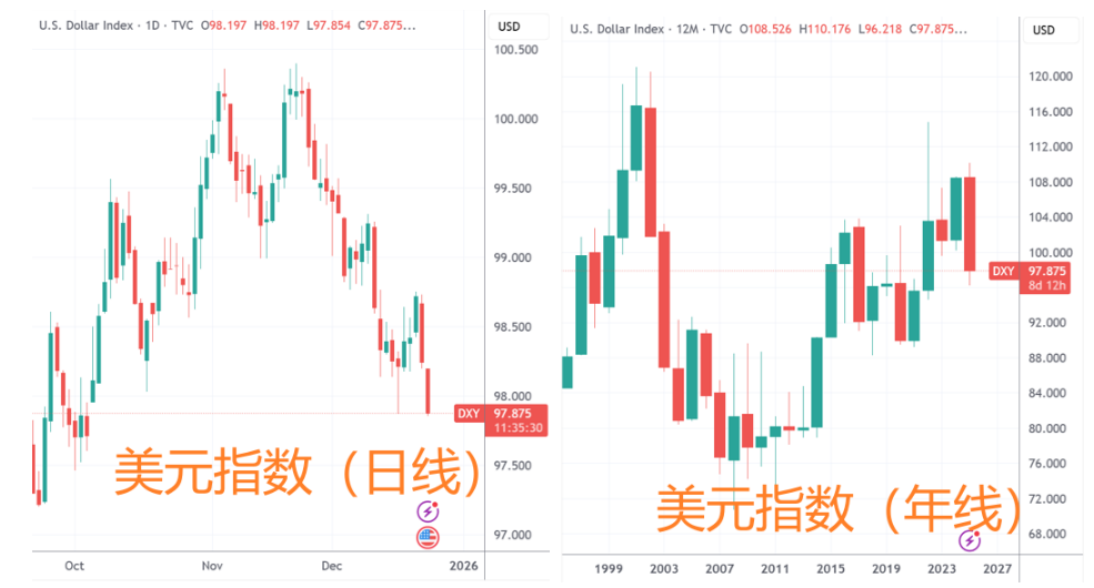 截至发稿,美元指数也在周二持续下跌。年初至今,美元指数已经下跌超9%,稍稍再多跌一些,就将创出2002年以来的最大年度跌幅。