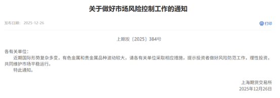 上期所周五发布关于做好市场风险控制工作的通知。上期所表示,近期国际形势复杂多变,有色金属和贵金属品种波动较大,请各有关单位采取相应措施,提示投资者做好风险防范工作,理性投资,共同维护市场平稳运行。