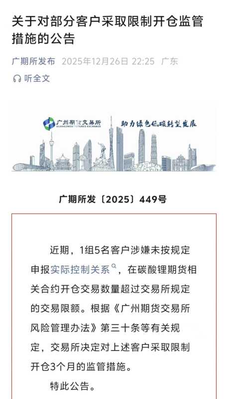 广期所则发布公告,针对1组5名在碳酸锂期货相关合约开仓数量超过交易所规定交易限额的客户,采取限制开仓3个月的监管措施。