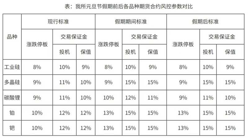 同时,广期所、郑商所同日也发布了关于节假期间调整涨跌停板幅度保证金标准的相关通知。其中,广期所旗下碳酸锂、铂、钯等期货品种假期上调涨跌停板幅度;这三个品种与多晶硅的交易保证金标准也在假期上调。