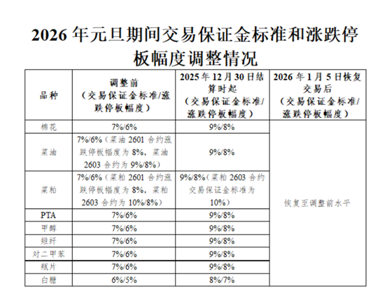 郑商所旗下棉花、菜油、菜粕、PTA、甲醇、短纤、对二甲苯、瓶片期货合约交易保证金标准和涨跌停板幅度假期上调;菜粕期货2603合约和白糖期货合约也出现相应调整。