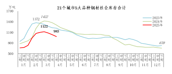 中钢协数据显示,4月上旬全国21个城市五大品种钢材社会库存环比下降5.1%,显示出库存持续下降态势。与年初相比增加49.2%,但与上年同期相比下降24.8%。