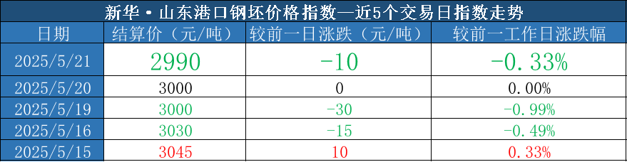新华财经北京5月21日电(陆子琛)截至5月21日,新华·山东港口钢坯价格报2990元/吨,较前一交易日下跌10元/吨,跌幅0.33%。这一变动反映了近期钢材市场的微妙调整。