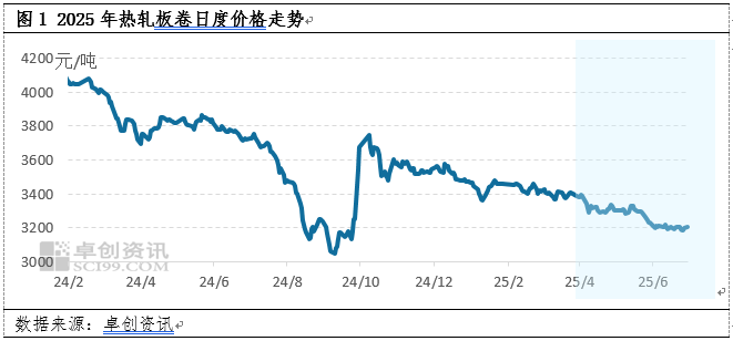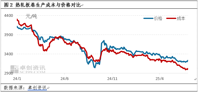 成本方面来看,2025年以来,热轧板卷主要的原材料焦炭与铁矿石价格持续走弱,致使热轧板卷成本线震荡下滑,截至6月底,热轧板卷生产成本降至3000元/吨关口附近,低成本难以对价格形成支撑,在供需表现较为低迷的背景下,成本下滑一定程度上对现货价格形成拖累。