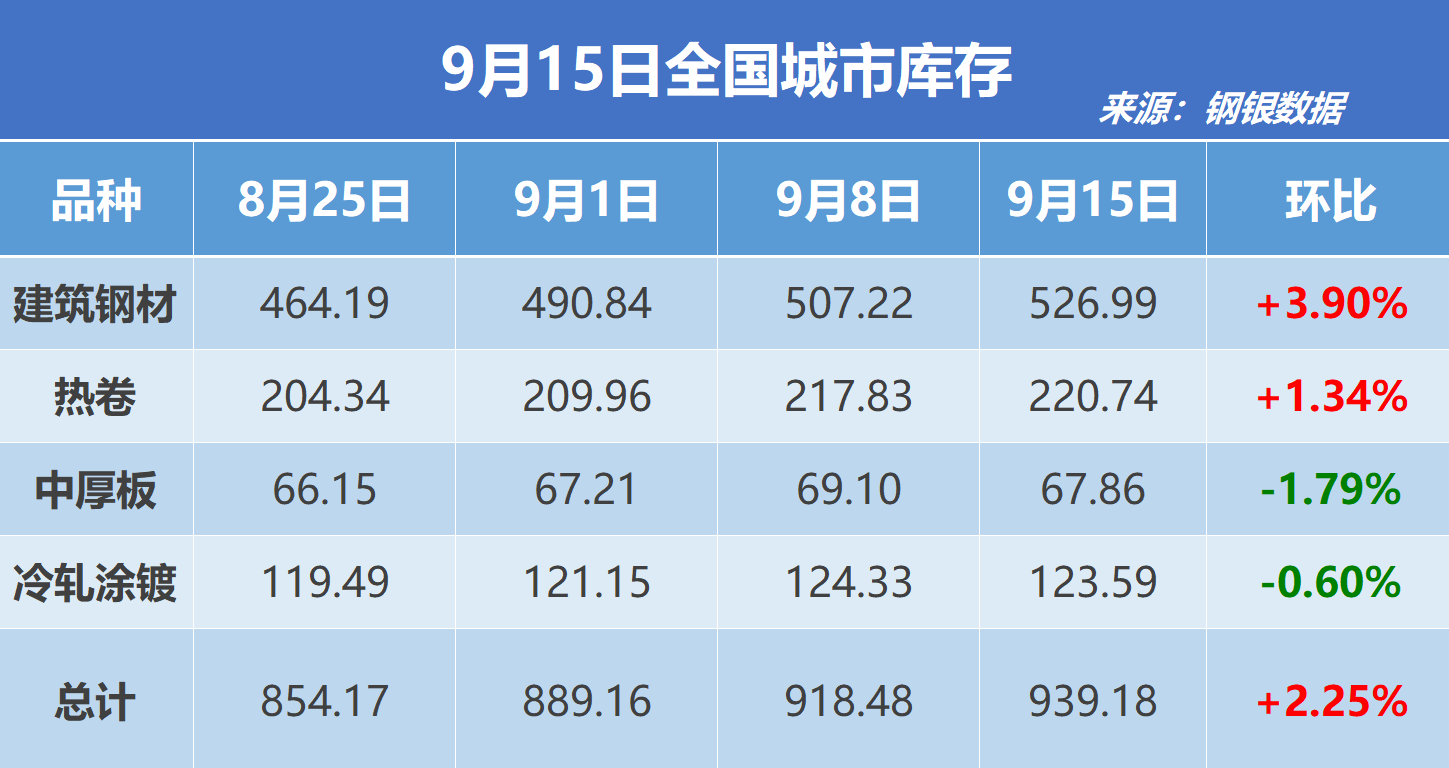 新华财经报道,截至9月15日,全国钢市总库存量增至939.18万吨,建筑钢材库存增长显著,热卷库存温和增加,而中厚板与冷轧涂镀库存有所减少,市场呈现结构性变化。