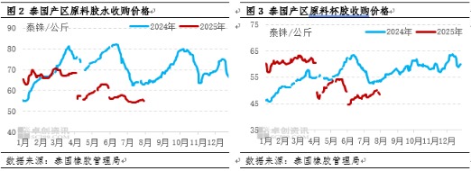 国内方面来看,7月西双版纳降雨天数偏多,且多为连续降雨,对割胶作业影响较大,新胶上量缓慢,叠加期货盘面偏强运行,对原料收购价格重心存有支撑。听闻本年度替代指标配合已经下达,后续将陆续进入国内市场对云南地区生产加工存在支撑。海南产区月内受台风影响一度导致日胶水产出稀少,但降雨减少后原料供给逐步恢复,叠加工厂补空单需求支撑,原料采买积极性受支撑,价格上行明显。