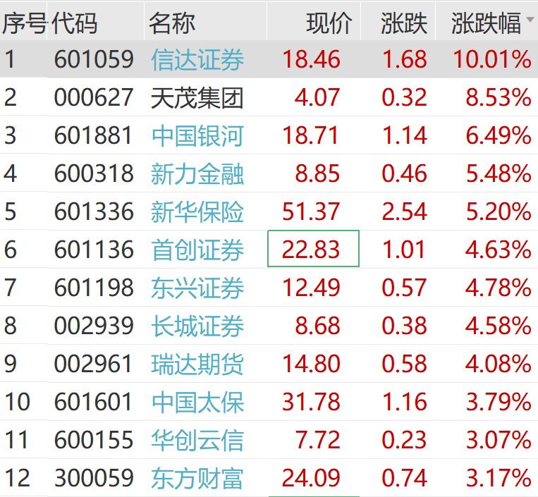 另外,上午非银金融板块集体拉升,信达证券迅速涨停,中国银河涨超6%,东兴证券、长城证券、首创证券、东方财富等多股跟涨。