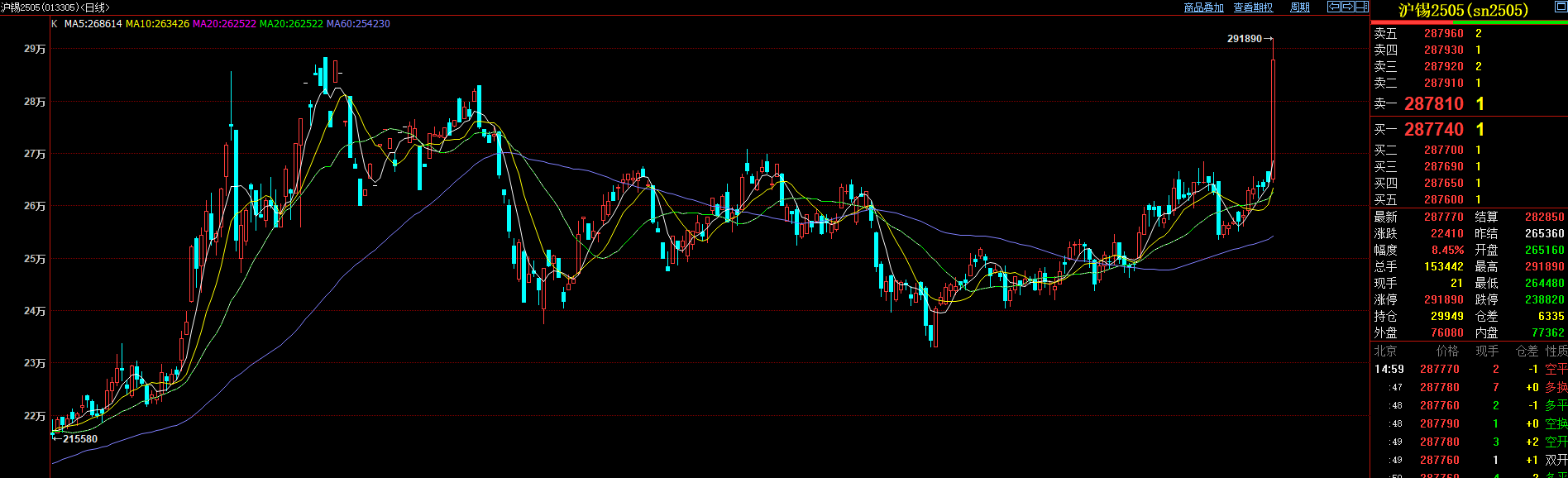 新华财经北京3月14日电(吴郑思)近期,有色金属市场频现供应紧张状况。先是刚果(金)暂停钴出口的消息持续发酵,13日晚间,Alphamin Resources宣布将暂停旗下位于刚果(金)的Bieis锡矿生产,导致锡价飙升。伦敦锡价大涨近9%,沪锡夜盘时段也跟随大涨超9%,14日日盘开盘后不久便封板涨停,最终收涨8.45%,报287770元/吨。