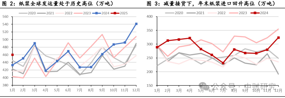 1.库存低位+晨鸣停机,年末补库释放流动性。2024年我国纸浆进口量同比下降,但处于历史高位,需求偏弱负反馈显现。晨鸣纸业停产导致原纸止跌回涨,纸浆补库带动原料高发运、阔叶木片高进口和浆价顺畅上行。