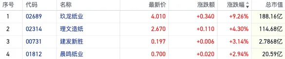 今日港股纸业股也集体拉涨,截至发稿,玖龙纸业(02689.HK)涨超9%,创年内新高。晨鸣纸业(01812.HK)、理文造纸(02314.HK)等个股也跟涨3%左右。