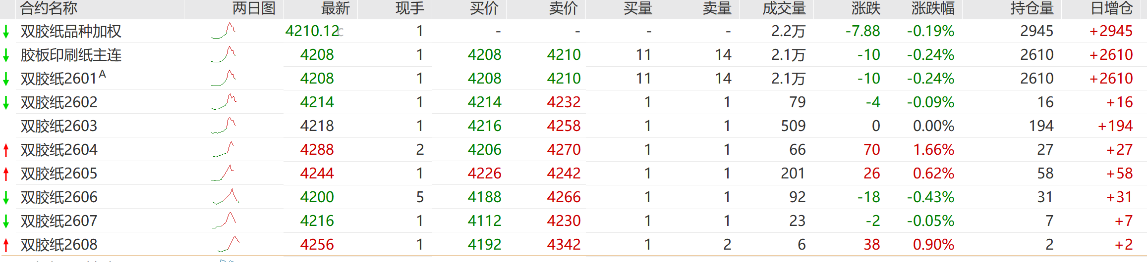 而展望双胶纸期货后市行情,宋霁鹏分析,上市初期期货价格受市场情绪、资金博弈影响较大。“若市场资金大量涌入,不排除价格出现非理性涨跌。同时,产业客户套期保值操作策略的差异,以及宏观经济数据、政策消息的发布,都可能成为短期价格波动的触发因素。预计在未来1-2个月内,主力2601合约价格将在4100-4400元/吨区间宽幅震荡。”