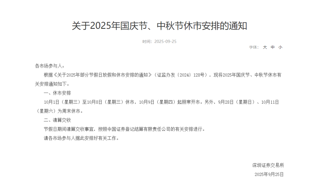 港股通交易方面,深交所信息显示,10月1日(星期三)至10月8日(星期三)不提供港股通服务,10月9日(星期四)起照常开通港股通服务。另外,9月28日(星期日)、10月11日(星期六)为周末休市。港股通交易的清算交收事宜,按照中国证券登记结算有限责任公司的安排进行,投资者需留意相关变化。
