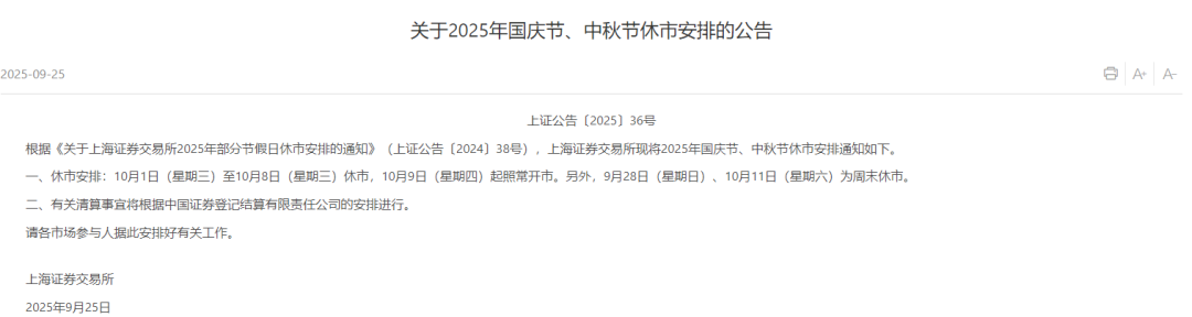 在此之前,昨日(9月24日),上海国际能源交易中心也发布了《关于2025年国庆节、中秋节期间有关工作安排的通知》,具体内容如下: