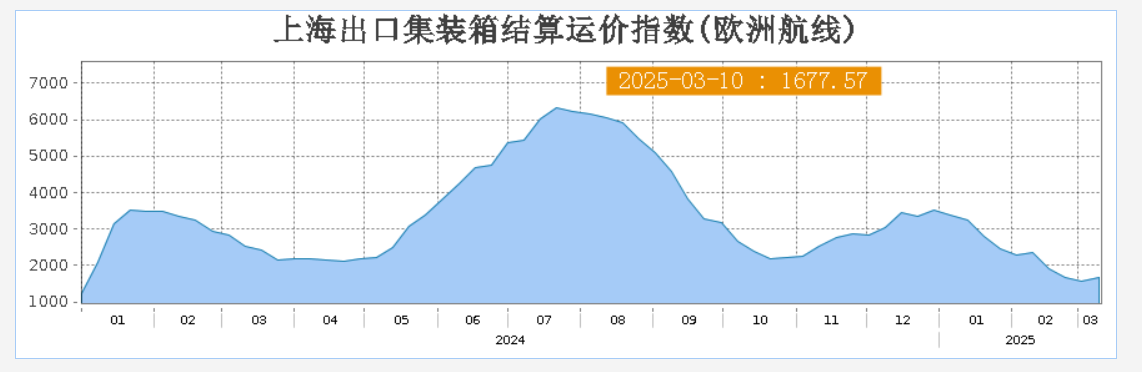 截至2025年3月10日,上海出口集装箱结算运价指数(欧洲航线)报1677.57点,与上期相比显著上涨6.1%。这一增长反映了全球贸易活动的回暖和欧线集运市场的持续繁荣,预示着未来将有更多的货运需求。