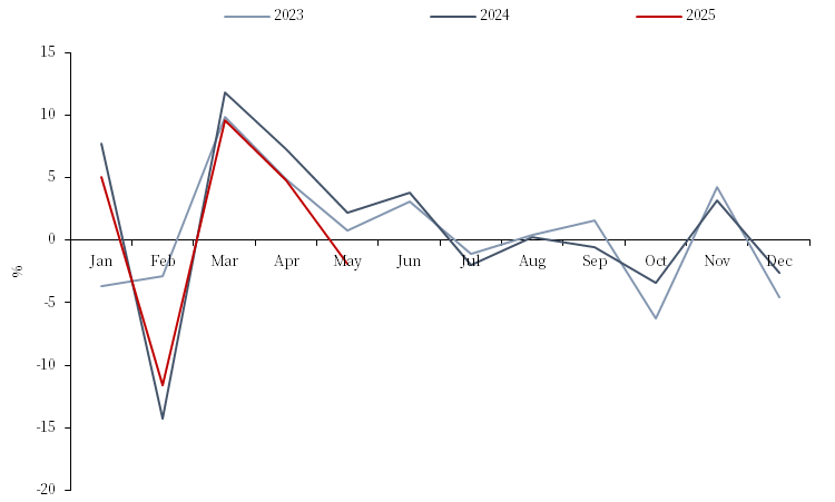 数据层面显示:(1)需求端,5月数据尚未完全公布,但中韩两国出口高频数据已有所反映。5月前10天,韩国向欧盟出口金额同比减少38.11%,向美国出口金额同比减少30.41%;中国重点港口集装箱吞吐量5月第一周环比4月周均减少1.86%。(2)供给端,5月远东至北欧运力环比增长3.4%;美西线4-6月撤出5条航线,运力同比减少。且高频数据显示,中国至美国运力大幅下降后迅速反弹。