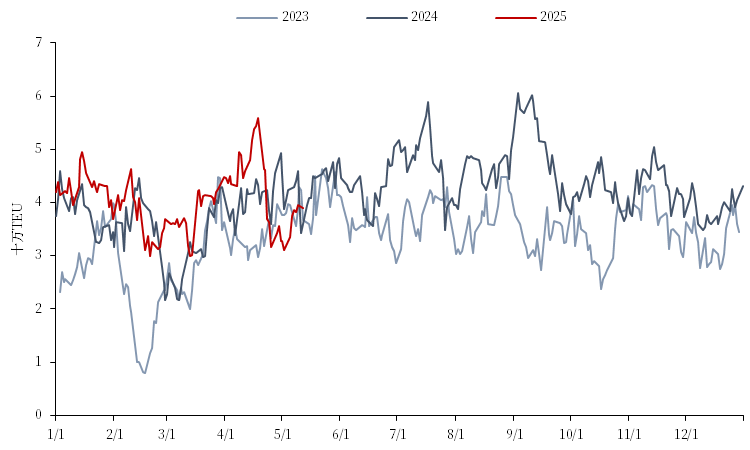 若中美贸易关系持续紧张至第三季度,欧美航线旺季将受限。但昨日谈判取得的进展可能逆转这一局面,增强预期,改善市场供需现实,使市场进入正反馈。美线货量开始大量发运,抢运、旺季增量及美国补库需求同时到来,美线将面临运力紧张;欧线运力压力减轻,中欧经济需求端动能边际修复,旺季预期重回。