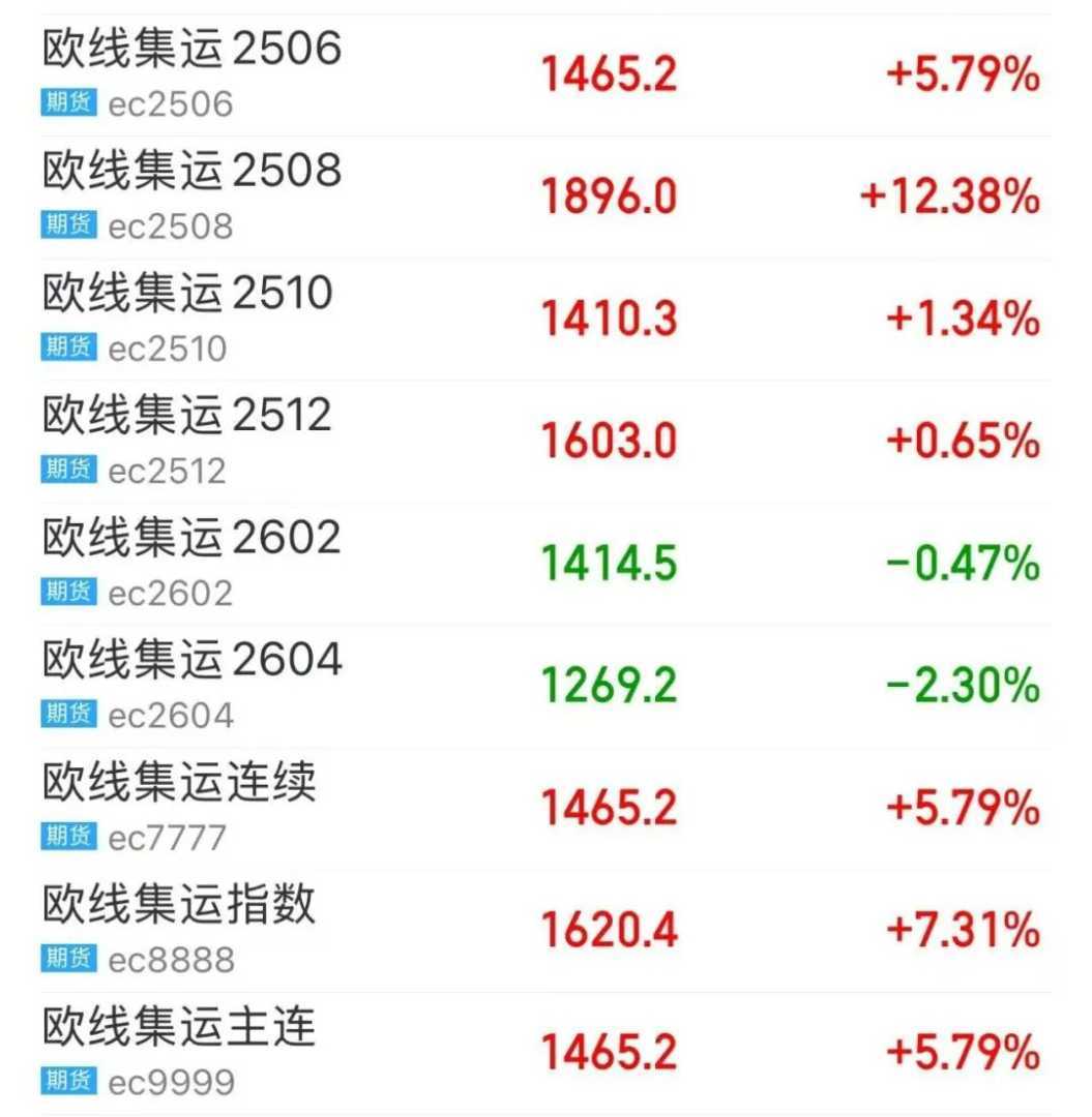 集运指数(欧线)期货近日再度大涨!13日,集运指数主力合约盘中涨超10%,截至收盘,主力合约涨近6%,2508合约更是涨超12%。昨日,该指数主力合约已涨超14%,市场热度持续攀升。