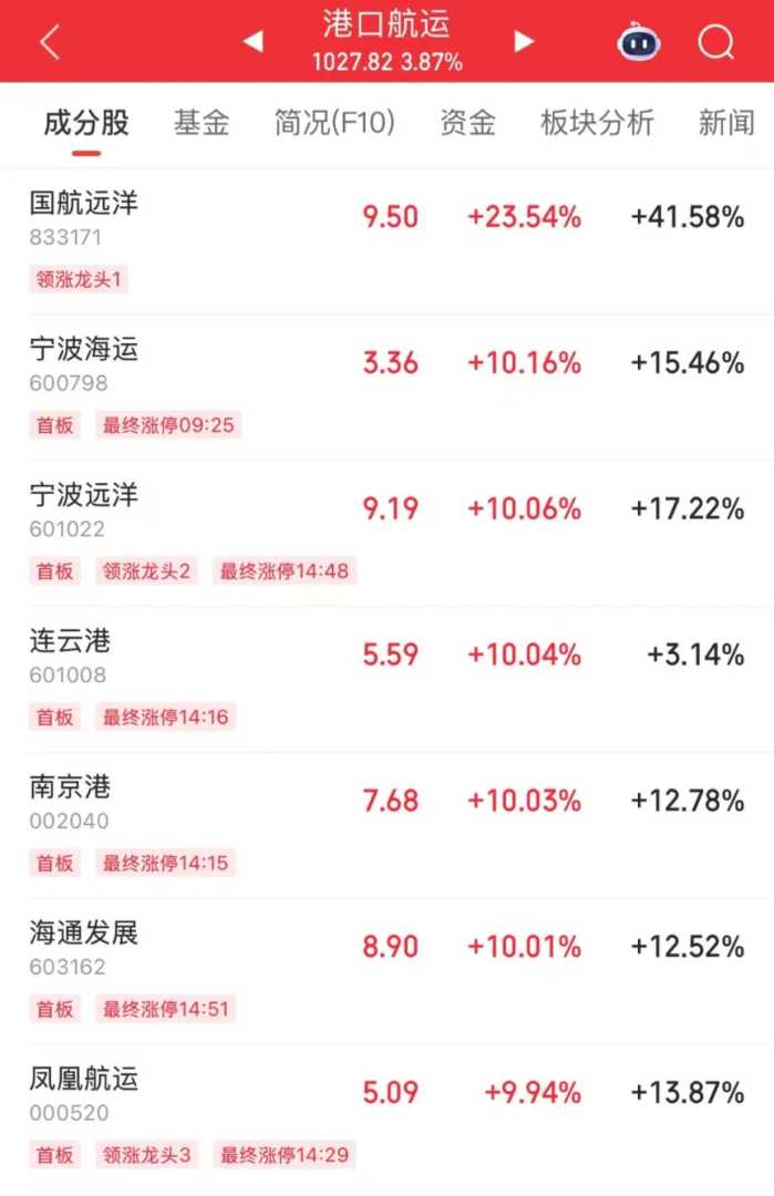 A股航运板块也积极响应,掀起涨停潮。国航远洋涨超23%,宁波海运、宁波远洋、南京港、海通发展、凤凰航运等多只个股涨停,珠海港、锦江航运、厦门港务、重庆港等个股也涨幅居前,显示出市场对集运市场的乐观预期。