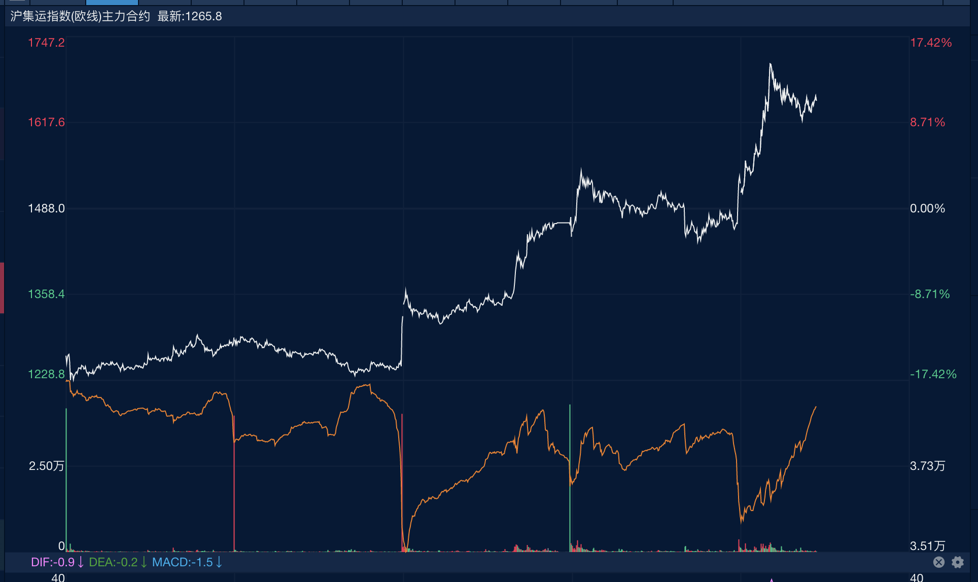 新华财经上海5月14日电 中美达成重要共识后,宏观利好消息直接推升集运指数(欧线)期货主力合约价格,本周以来累计涨幅达32%,突破1700点,创一个月新高。这一上涨趋势强化了期货市场的抢运逻辑。