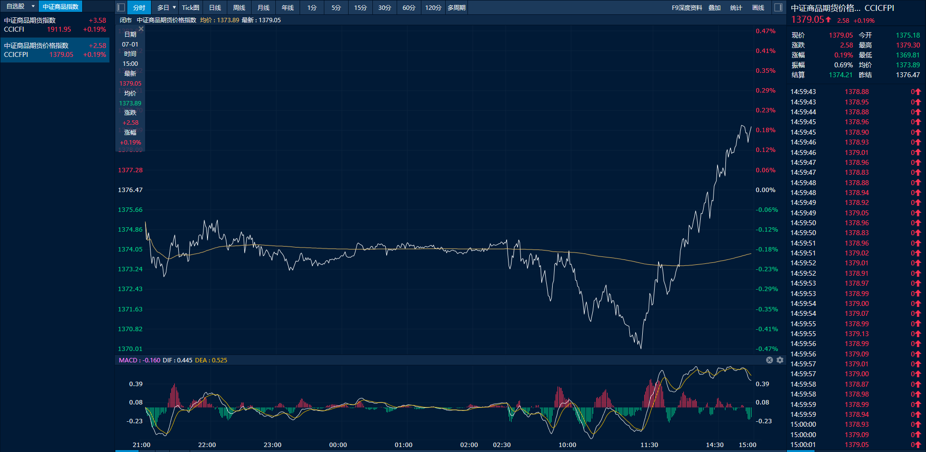 截至1日下午收盘,中证商品期货价格指数收报1379.05点,较前一交易日上涨2.58点,涨幅0.19%;中证商品期货指数收报1911.95点,较前一交易日上涨3.58点,涨幅0.19%。
