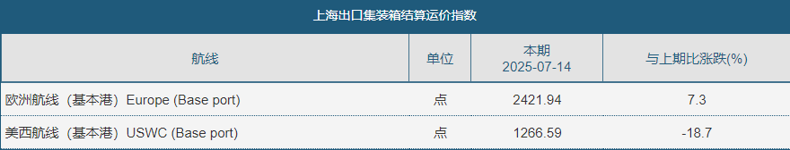 上海航运交易所数据显示,截至7月14日,欧洲航线运价指数报2421.94点,涨7.3%;美西航线报1266.59点,跌18.7%,反映国际航运市场动态。