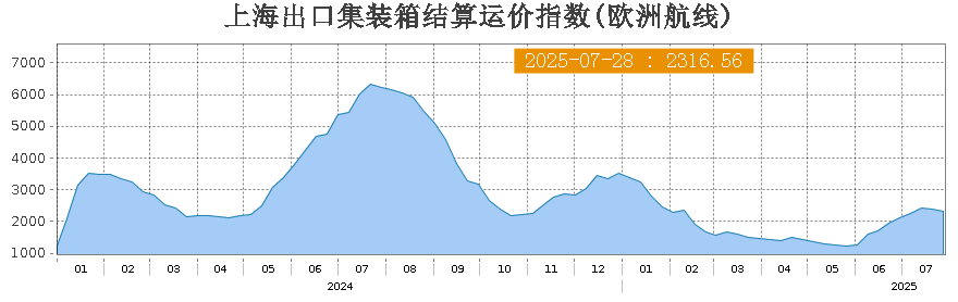据上海航运交易所数据,截至2025年7月28日,上海出口集装箱结算运价指数(欧洲航线)报2316.56点,较上期跌3.5%,反映欧洲航线集装箱运输市场动态。