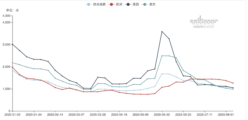 从运价表现来看,现货运价方面,极羽科技提供的数据显示,截至8月8日,美线(上海至洛杉矶/长滩)最低报价船司为赫伯罗特,8月开航航次运费为1598美元/FEU,较上周下降3%;7月1日时显示的数据,赫伯罗特当月的最低报价为2148美元/FEU。欧线方面的运费报价环比也有回落,最低报价(不分船司)从2900美元/FEU降至2535美元/FEU。
