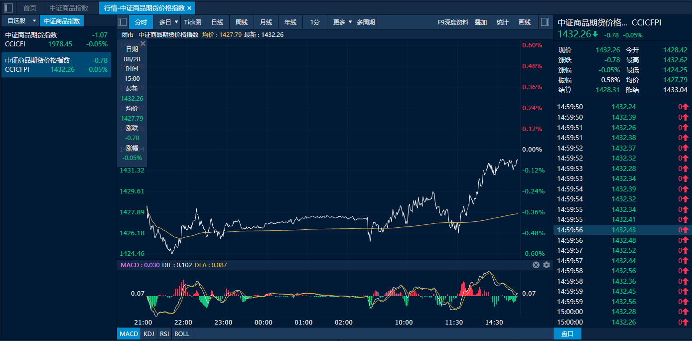 截至28日下午收盘,中证商品期货价格指数收报1432.26点,较前一交易日下跌0.78点,跌幅0.05%;中证商品期货指数收报1978.45点,较前一交易日下跌1.07点,跌幅0.05%。