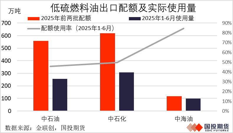 产量方面,金联创数据显示今年1-6月中石油、中石化、中海油分别生产低硫燃料油256万吨、306万吨、99万吨,同比2024年1-6月总计下滑119万吨(-15.3%)。值得注意的是,2024年第三批配额发放于9月中旬,2024年1-9月国内炼厂低硫燃料油配额使用率约为94%,中石油与中海油在9月配额较为紧张。然而,今年第二批配额提前于3月底发放,且市场消息称第三批配额将于8月发放,配额发放量增加及发放时间提前均意味着国内低硫燃料油增产空间更为充裕,然从配额使用率来看,今年截至6月底国内炼厂低硫燃油配额使用率仅50%。中性预估下,若按1-6月产量均值线性外推7-9月产量,9月底前两批配额使用率仅75%;即便以近五年产量中偏乐观情况预估7-9月产量,9月底前两批配额使用率仅约80%。
