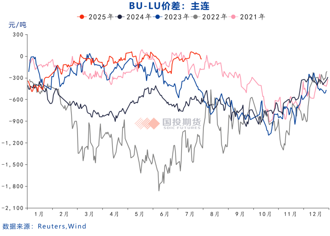 我们认为低硫燃料油供应压力仍较为有限。主要因为今年国内炼厂低硫生产积极性低区别于2023年与2024年配额制约,更多是由于低硫燃料油在油品中相对利润较差。从炼厂加工路线切换来说,配备渣油加工装置的炼厂根据利润在沥青、汽柴油以及燃料油等产品之间切换。今年上半年以沥青为代表的炼厂副产品利润表现亮眼,以沥青裂解价差为例,5月中旬一度达到近五年同期绝对高位,BU-LU主力合约价差亦处近五年同期偏高水平,沥青利润走强驱动部分炼厂降低低硫燃料油产量以增产沥青。沥青需求领先指标同比改善明显,8-9月是沥青需求关键观测窗口期,炼厂沥青排产计划提升,对低硫燃料油供应预计仍有一定分流效应。