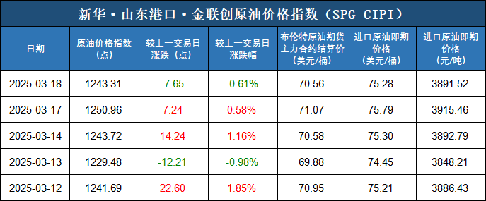 新华财经北京3月19日电(郑大伟)截至2025年3月18日,新华·山东港口·金联创原油价格指数(SPG CIPI)报1243.31点,较前一日下跌7.65点,跌幅0.61%;进口原油即期价格为75.28美元/桶,折合人民币3891.52元/吨。山东港口进口原油综合到岸贴水估价为3.66美元/桶,较前一日下跌0.04美元/桶,跌幅1.08%。这些数据清晰地反映了近期原油市场的价格波动。