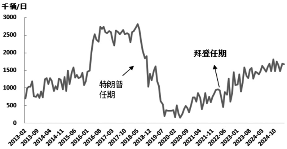 美国原油产出保持稳定态势,自年初以来维持在1350万桶/日上下。据机构预测,2025年美国原油产量增幅在30万桶/日左右。尽管特朗普任期内美国原油产量突破1300万桶/日,达到历史最高水平,但当前页岩油上游投资活动景气程度欠佳。