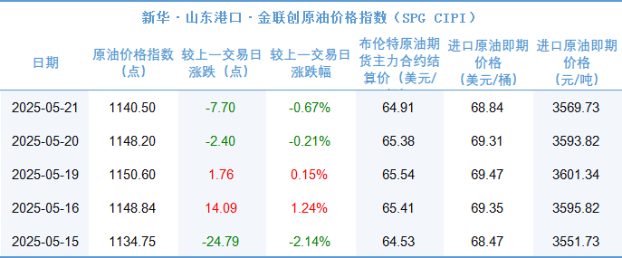 截至2025年5月21日,新华·山东港口·金联创原油价格指数(SPG CIPI)较前一日下跌0.67%。进口原油即期价格及山东港口进口原油综合到岸贴水估价也有相应变动,数据来源于新华财经数据库及金联创。
