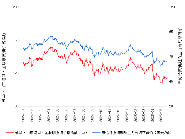新华财经北京5月26日电(郑大伟) 截至2025年5月23日,新华·山东港口·金联创原油价格指数(SPG CIPI)报1134.63点,较前一交易日上涨0.87点,涨幅0.08%。进口原油即期价格为68.50美元/桶,相当于人民币3551.36元/吨。山东港口进口原油综合到岸贴水估价为3.36美元/桶,较前一交易日下跌0.13美元/桶,跌幅达3.72%,显示出原油市场动态变化。