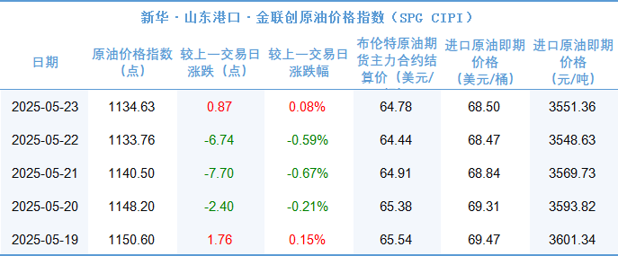 截至2025年5月23日,新华·山东港口·金联创原油价格指数报1134.63点,较前一日微涨0.08%。进口原油即期价格、山东港口进口原油综合到岸贴水估价等数据也有所变动,这些数据和分析对于理解原油市场趋势具有重要意义。