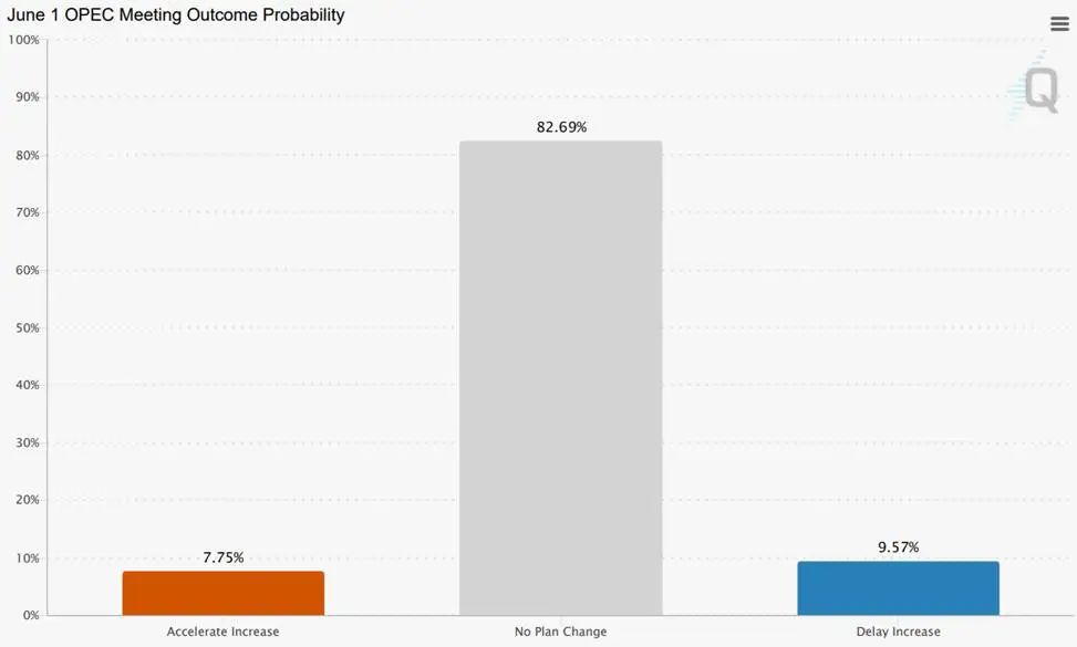 芝商所OPEC观察工具预测,OPEC+6月1日会议维持产量不变的概率达八成。但有报道称,OPEC+正讨论7月再次大幅增产41.1万桶/日,若获批,将对油价构成重大利空。