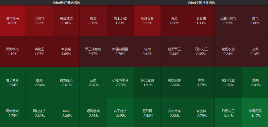 板块方面,能源设备板块开盘表现出色,油气股领涨,同时黄金概念股也呈现走强趋势,海运、电力、天然气等板块同样活跃;而谷子经济、短剧游戏、文化传媒等板块则相对落后。