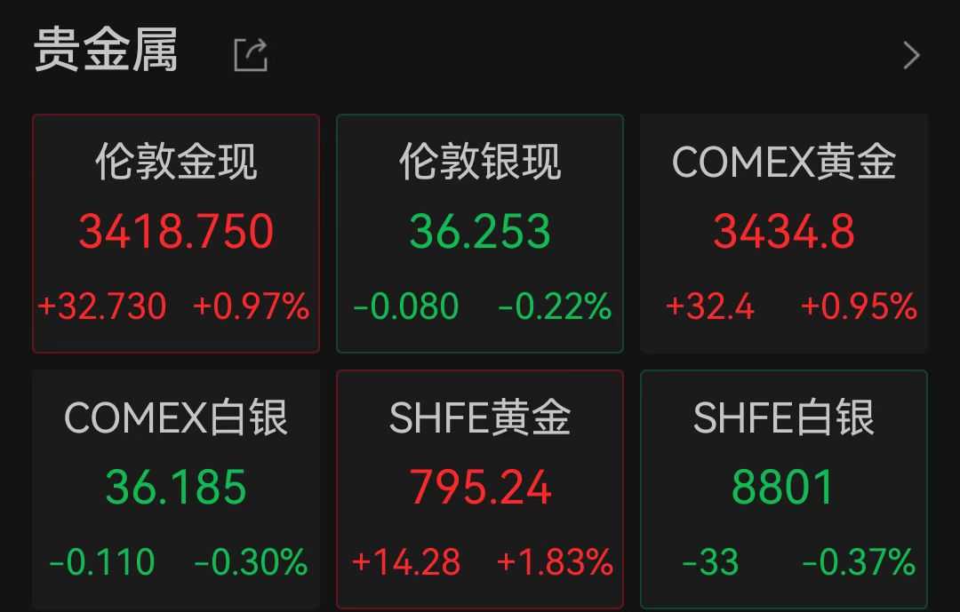 避险情绪升温,黄金资产亦受到追捧,伦敦金现、COMEX黄金均上涨近1%,分别报3418.75美元/盎司、3434.80美元/盎司。