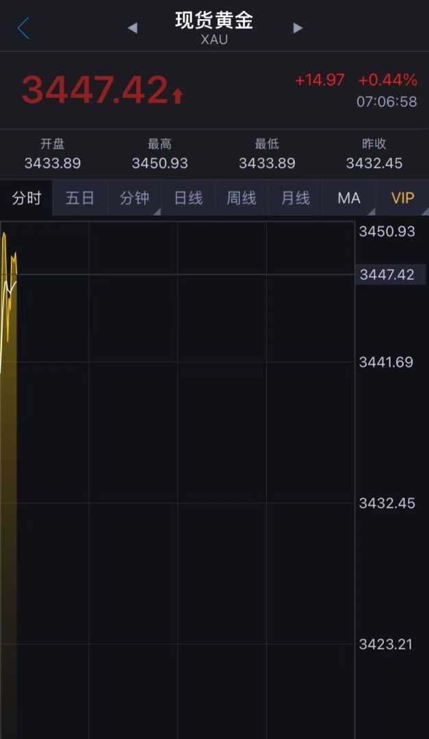 现货黄金周一高开近20美元后快速回调,现报3447.42美元/盎司,但地缘政治紧张局势仍为金价提供支撑。