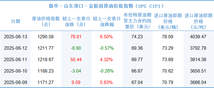 截至2025年6月13日,新华·山东港口·金联创原油价格指数报1290.58点,较前一日上涨78.81点,涨幅6.50%。进口原油即期价格为78.09美元/桶,山东港口进口原油综合到岸贴水估价为3.26美元/桶。数据来源新华财经数据库及金联创。
